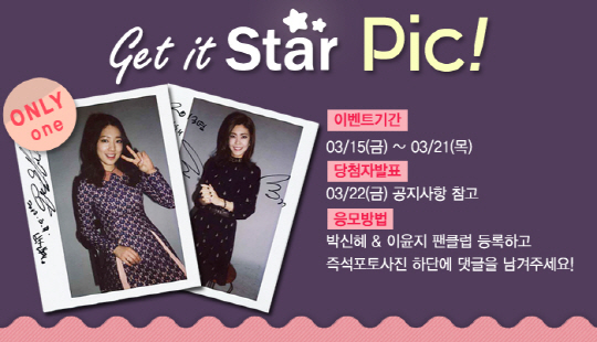 스타 스타일 매거진 어플리케이션 '겟잇스타'의 '겟잇! 스타Pic' 이벤트 그 13번째 스타! 한국영화계의 새역사를 쓰고 있는 '7번방의 선물'에서 예승의 성인역을 완벽히 소화한 박신혜 그리고 최근 종영한 SBS 드라마 '대풍수'에서 반야역을 연기한 배우 이윤지입니다.