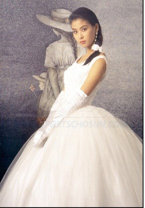 또 민소매 웨딩드레스를 입고 서 있는 고소영은 팔에는 흰 장갑이 매치된 90년대의 다소 촌스러운 패션에도 완벽히 소화해 큰 환호를 받고 있다.