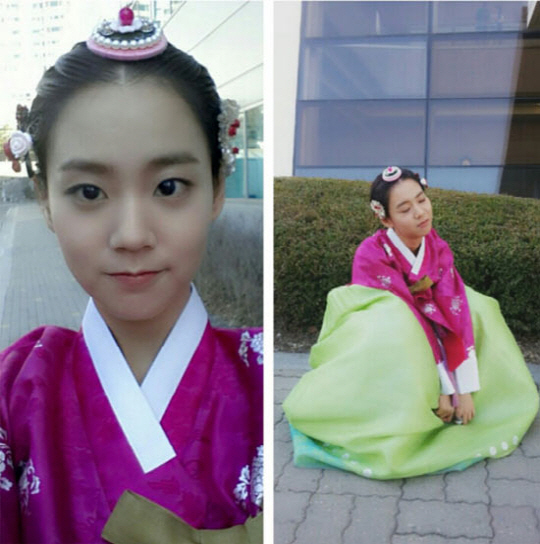 공개한 사진은 분홍 저고리와 연두색 치마의 한복을 곱게 차려 입은 한승연의 모습이 담겨 있다. 이는 지난 11일 열린 SBS 새 월화드라마 '장옥정, 사랑에 살다' 기자 간담회때 모습으로 간담회 직후 긴장이 풀린 채 길바닥에 주저앉아 귀여운 표정을 짓고 있는 모습이 인상적이다. 긴장하고 피곤해 보이는 모습이 역력한 한승연의 고운 한복자태에 사랑스러운 동안외모 또한 눈길을 끌고 있다.