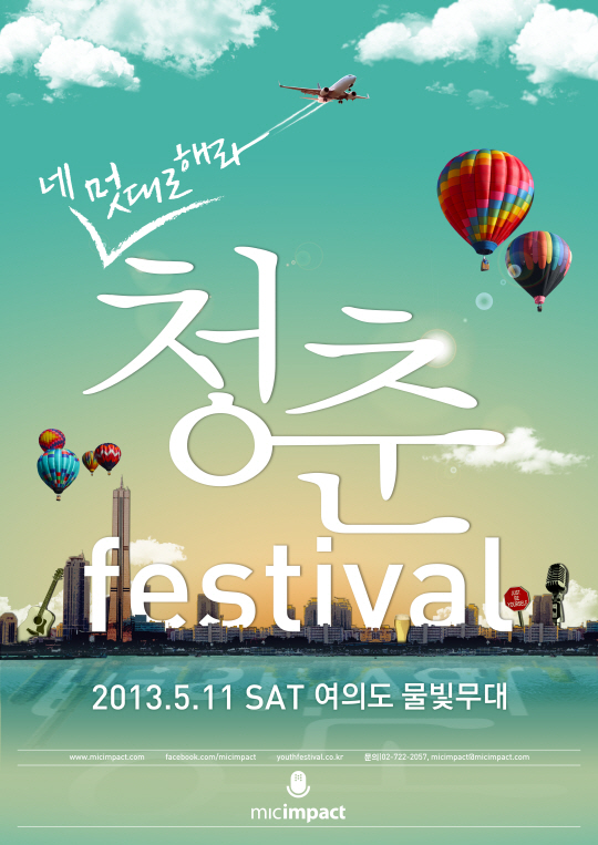 올해로 5회째를 맞이한 '청춘 페스티벌'은 오는 5월 11일 서울 여의도 물빛무대에서 '네 멋대로 해라'라는 컨셉트로 진행된다. 이미 '얼리버드 티켓'은 완판됐고, 티몬 2차 티켓(3월 19일 오픈, 30%할인, 500매 한정)을 앞두고 있다.