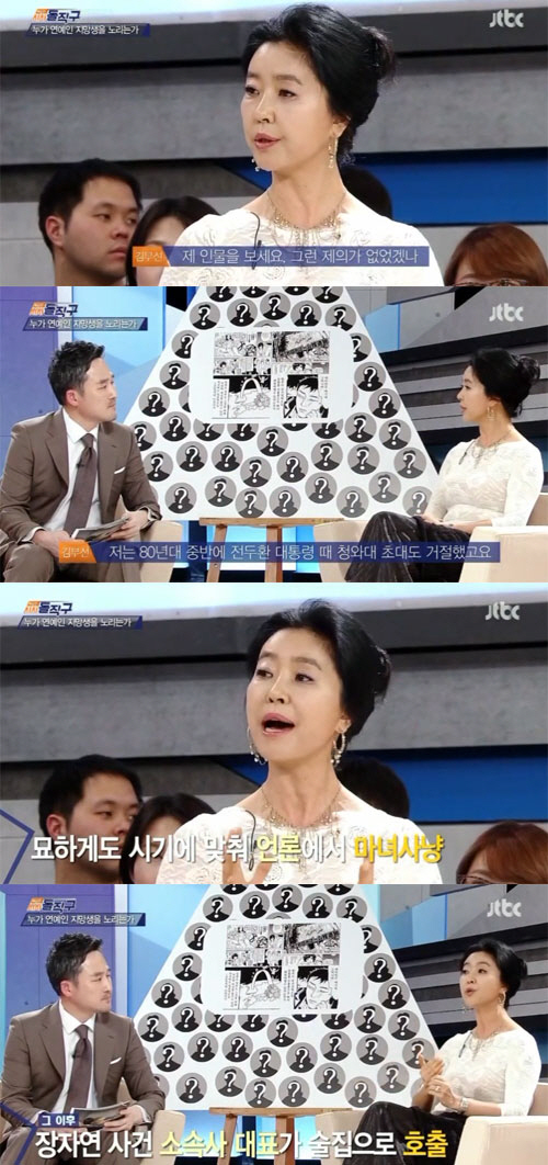 김부선은 "80년대 중반에 전두환 대통령 때 청와대 초대도 거절했다. 나는 나이트클럽가서 춤추고 젊은 친구들과 즐기는 게 좋았다. 왜 아저씨들한테 술시중을 들어야하나했다"며 "하지만 술자리를 안 갔더니 묘하게 그 시기에 언론으로부터 어마어마한 마녀 사냥을 당했다. 두 차례 대마초를 피웠다고 나왔다. 대한민국 연예계와 정치계에 밀접한 사건이 대마초다. 이후 나는 완전히 매장되고 15년 동안 분식집에서 라면을 팔았다"고 회상했다.