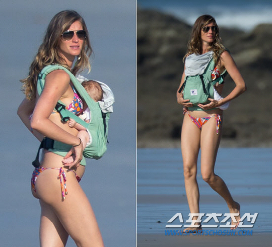 브라질 출신 톱모델 지젤 번천(32)이 생후 3개월 된 딸을 안고 '비키니 몸매'를 과시했다.