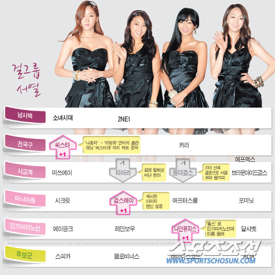 | 가요 관계자들 평가를 토대로 만든 '2013 걸그룹 서열'. 지난해 마니아층에서 사교계로 올라온 씨스타가 계속된 히트곡 행진으로 올해는 어느새 전국구에 이름을 올렸다. 심지어 넘사벽도 넘본다는 평가까지 나오고 있다. |