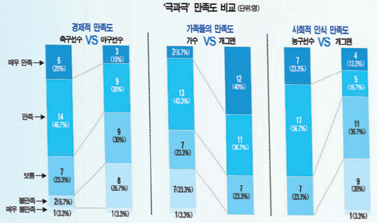 경제적 만족도(3.47) 역시 상향됐다는 분석이 나왔다. 사회적 위상이 올라가면서 CF 모델로 발탁되는 사례도 늘었고, 친근하고 유머러스한 이미지를 살려 각종 행사에 게스트로 출연하거나 버라이어티 프로그램을 병행하는 방식으로 수익구조가 다양화됐기 때문이다.