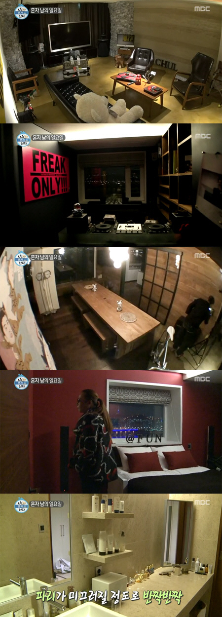 또 원목과 블랙의 조화가 고급스러운 거실은 모델 하우스처럼 한 치의 흐트러짐 없이 배치된 가구들과 인테리어 소품들로 눈길을 끌었다. 집안 곳곳에는 '무한도전' 속 노홍철의 캐릭터와 사진들이 장식돼 있었고, 한쪽 방에는 DJ 장비를 갖추고 있었다. 욕실은 파리가 미끄러질 정도로 반짝반짝하게 청소돼 있고, 야경이 한눈에 보이는 침실도 깔끔하게 정리돼 있었다.