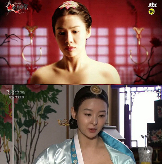 소용 조씨 역으로 출연 중인 여주인공 김현주는 극중에서 상궁이 "사내와 정을 통한 적이 있냐"라며 묻자 "그렇게 못 미더우시면 더 자세히 보시지요"라고 말하며 옷을 벗어 던졌다. 이어 그녀의 가슴 라인 윗부분이 드러난 것.