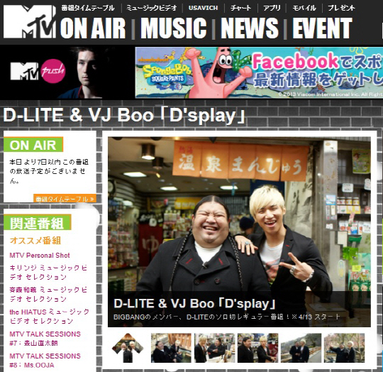 지난 21일 현지 연예 뉴스 사이트 '나타리'는 "빅뱅 대성이 솔로로 첫 고정 MC를 맡은 MTV 프로그램 '대성 앤 브이제이 부 디스플레이(D-LITE & VJ Boo D´splay)'가 오는 4월 13일 토요일 오후 6시 30분에 첫 방영된다"고 전했다.
