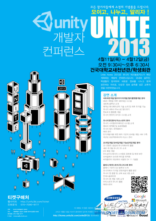 유니티 테크놀로지스 코리아는 오는 4월 11일부터 12일까지 양일간 서울 건국대 새천년관에서 유니티 개발자 컨퍼런스 '유나이트 코리아 2013(Unite Korea 2013)'을 개최한다고 28일 밝혔다.