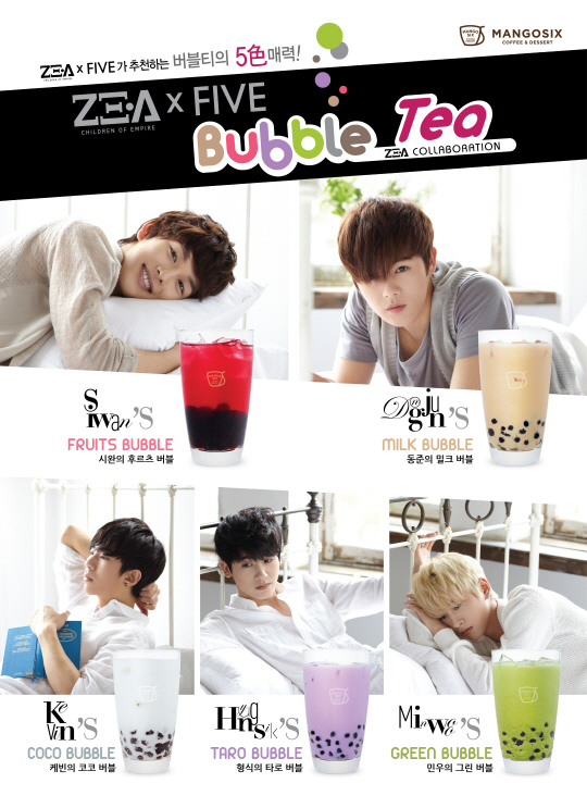 프리미엄 디저트 카페 망고식스가 제국의 아이들과 손잡고 국내 카페업계 최초로 아이돌 콜라보레이션 캐릭터 음료 '제아 버블티(ZE:A BUBBLE TEA)' 5종을 출시한다.