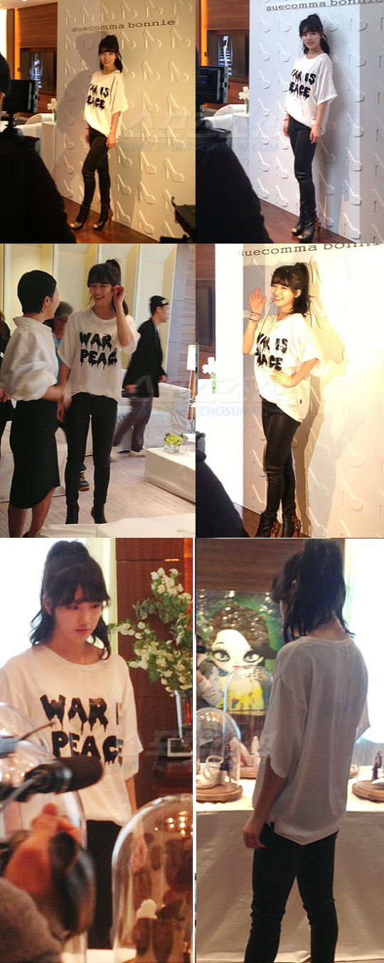 사진은 지난 28일 슈즈브랜드 '슈콤마보니 10주년' 기념행사에 참석한 수지의 모습. 사진 속 수지는 시스루 뱅 헤어스타일에 포니스타일로 머리를 높게 묶고, 헐렁한 흰색 티셔츠에 딱 붙는 가죽바지를 매치한 시크한 패션을 뽐냈다.