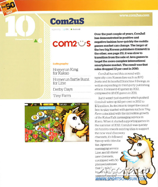 컴투스가 영국의 모바일 게임 웹진 '포켓게이머'(PorketGamer.biz)에서 선정한 '2013년 세계 Top 50 개발사'(Top 50 Developer 2013)에서 10위로 선정됐다.