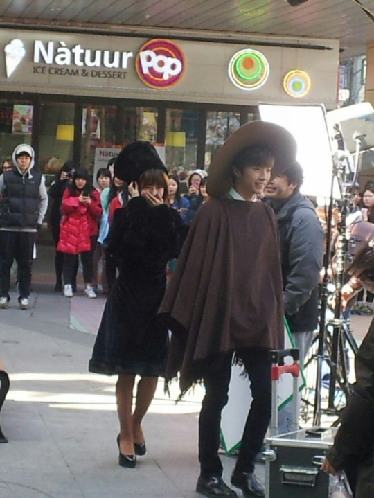 우영은 '은하철도 999' 철이를 연상케 하는 모자와 망토를 걸치고 있는 모습이다. 반면 메텔로 변신한 효성은 검은색 모자에 검은색 원피스를 입고 있다. 효성은 일반인들의 시선이 쑥스러운지 입을 가리고 웃고 있다.