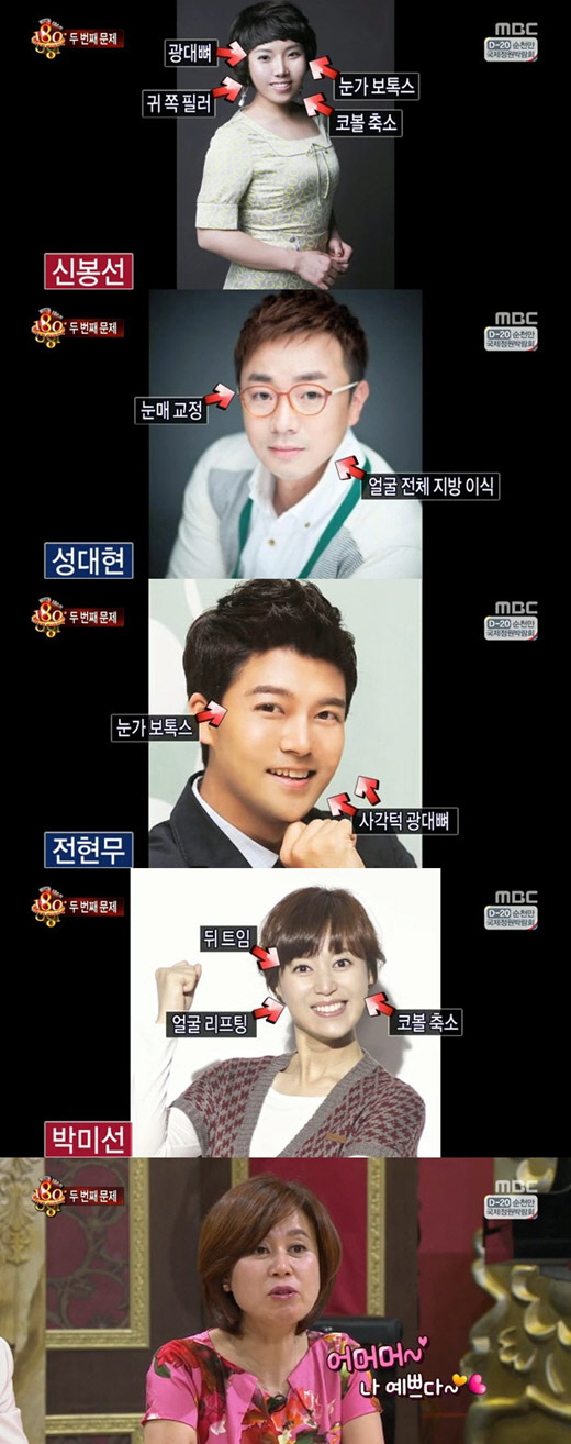 특히 박미선은 뒤트임, 얼굴 리프팅, 코볼 축소 가상 시술로 걸그룹 못지않는 완벽한 미녀로 변신, 현재보다 훨씬 젊어진 모습을 하고 있어 놀라움을 유발했다.자신의 가상 성형 사진을 본 박미선은 "어머 예쁘다. 나 진짜 할까봐"라며 만족감과 관심을 드러냈다. <스포츠조선닷컴>