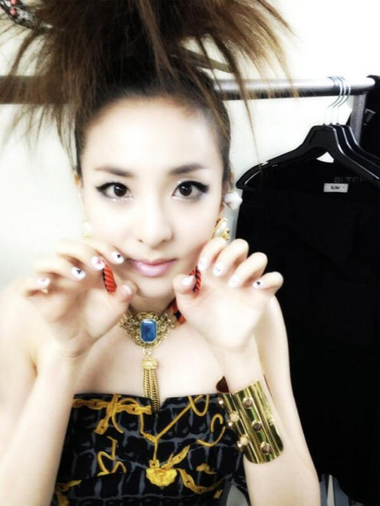 매번 개성 있는 패션과 헤어스타일을 선보이는 산다라박은 이번에도 비녀를 꽂은 분수머리와 다양한 무늬로 네일아트를 한 모습을 공개했다.