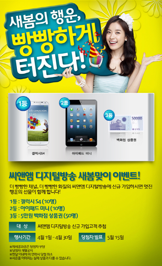 이달 1일부터 4월 30일까지 한달 동안 씨앤앰 디지털방송에 신규 가입 고객은 자동으로 이벤트 추첨 대상에 오른다. 1등 10명에게는 4월 출시 예정인 갤럭시S4 단말기를, 2등 10명에게는 아이패드미니 WiFi, 3등 50명에게는 5만원 백화점 상품권을 추첨을 통해 증정한다. 총 70명에게 2천만원 상당의 푸짐한 행운이 전해진다.