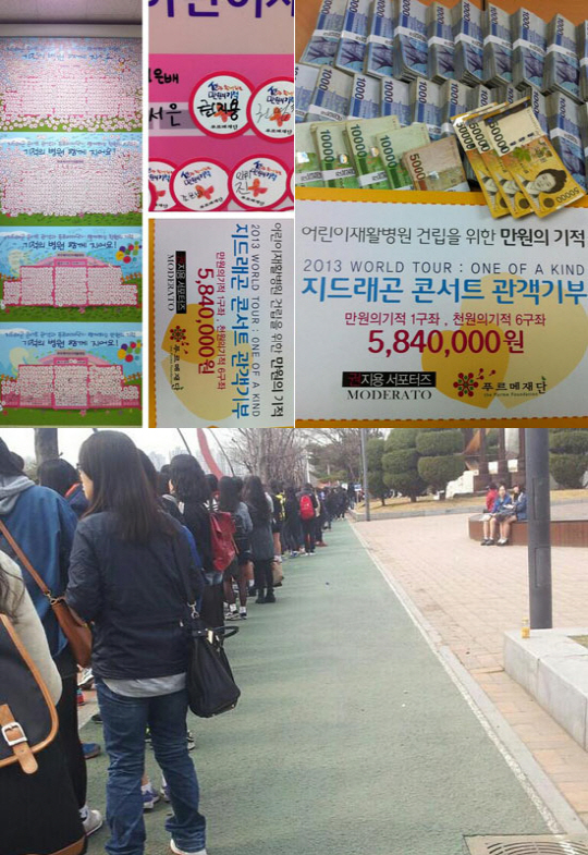 공개된 사진에는 지드래곤의 콘서트 관객들이 어린이재활병원 건립을 위해 기부한 결과가 담겨있다. 수많은 팬들의 이름이 담긴 스티커가 부착된 판넬과 기부한 성금들이 감동을 자아내며 보는 이들의 시선을 모은다.