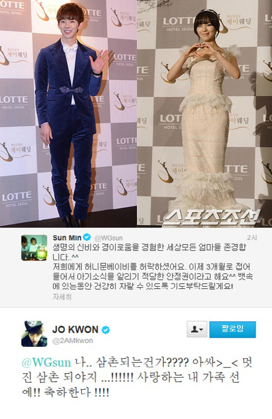 선예의 임신 소식에, 조권 외에도 원더걸스 멤버 예은은 "congratulations Min Leader!"라며 축하의 말을 전했고, 백아연 역시 "기도할께요 언니, 축하드려요"라며 축하의 메시지를 남겼다.