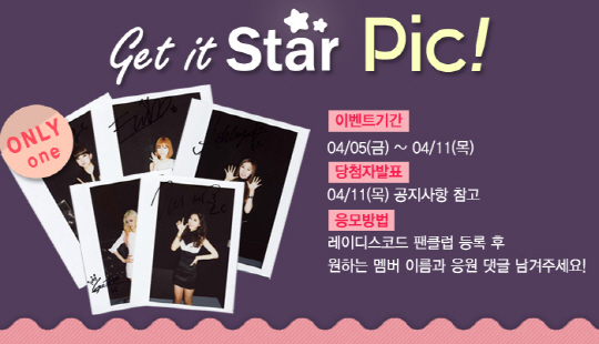 스타 스타일 매거진 어플리케이션 '겟잇스타'의 '겟잇! 스타Pic', 그 15번째 시간! 이번에는 '레이디스 코드'가 성원에 보답하고자 친필사인이 담긴 멤버별 독사진을 내놓았습니다. 개성 넘치는 '섹시 요정' 리세, 소정, 애슐리, 은비, 주니의 친필사인포토를 소장할 절호의 기회, 지금 겟잇스타에서 시작됩니다!
