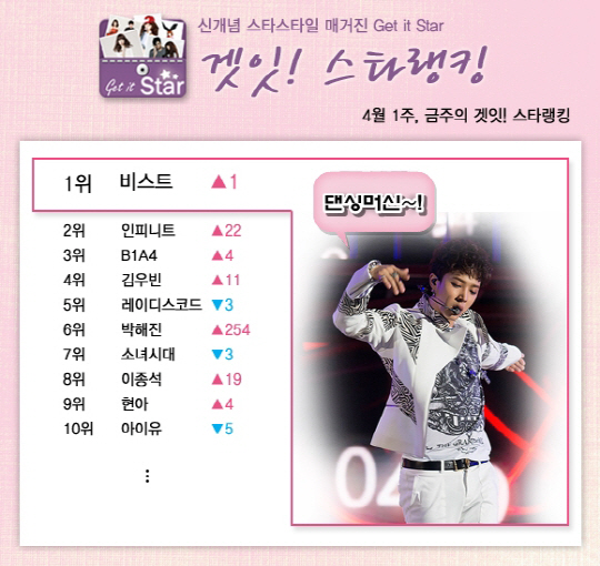 비스트의 파워, 대단합니다! 겟잇스타랭킹 2013년 4월 1주차에도 비스트가 부동의 선두를 지켰습니다. 별다른 그룹 활동이 없음에도 강력한 팬덤을 앞세워 위력을 떨치고 있는 '비스트'의 파워, 이들의 아성을 무너뜨릴 스타는 언제쯤 등장할까요.