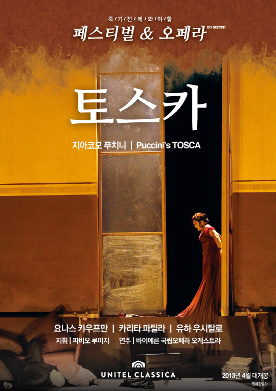 이번에 선보이는 '토스카'는 2010년 공연된 작품으로 '라보엠', '나비부인', '투란도트' 등으로 유명한 푸치니의 대표작 중 하나다. 1800년 이탈리아 로마를 배경으로 오페라가수 토스카와 그녀의 연인 카바라도시, 그리고 토스카를 차지하려는 악질 경감 스카르피아 사이에서 펼쳐지는 사랑과 질투, 죽음을 긴박하게 풀어냈다. 파비오 루이지의 지휘로 요나스 카우프만이 카바라도시 역을 맡았다. (전체관람가, 132분)