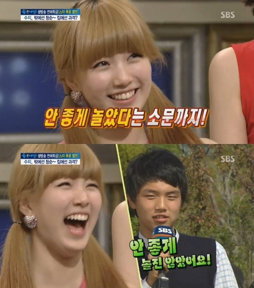 수지 남동생은 "누나가 인기를 얻으면서 '일진이다', '안 좋게 놀았다' 등의 루머를 듣는다. 가슴이 아프다. 사실 놀긴 놀았지만 안 좋게는 놀지 않았다"고 말해 웃음을 자아냈다.