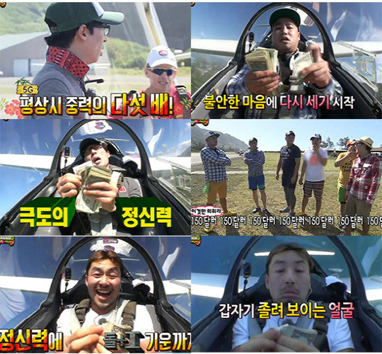 노홍철에게 하늘이 준 능력은 사기 능력이라고, 자신이 글라이더에 타야만 하는 위기 상황에 달러 한 장을 옆으로 휙 집어 던지며 1달러 부족하게 만드는 대놓고 사기 능력은 보는 이를 포복절도하게 하는 장면이었다.