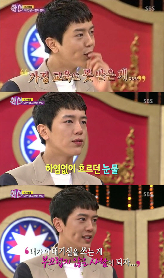 그리고는 "선배 일이 끝날 때 까지 기다리다 다시 옷방으로 들어가 샌드위치를 먹고 뒤처리 깔끔히 하고 돌아왔는데, 그 선배연기자분이 '누가 여기 입 닦은 휴지를 뇌두냐'"며 버럭 화를 냈고, 이내 선배연기자는 "가정교육도 못 받은 게"라는 말을 해 큰 상처를 입은 일화를 고백하며 눈물을 글썽였다.