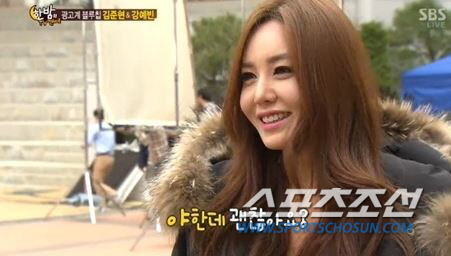 강예빈은 지난 10일 밤 방송된 SBS '한밤의 TV연예'에서 개그맨 김준현과 맥주 광고 촬영을 함께 하는 모습을 공개했다. 이날 방송에서 코트를 입고 있던 강예빈은 시원한 모습을 보여달라는 리포터의 요청에 "야한데 괜찮아요?"라고 되물으며, 훌러덩 벗었다. 이어 강예빈은 글래머러스한 몸이 그대로 드러나는 탱크톱으로 섹시한 포즈를 취했다.
