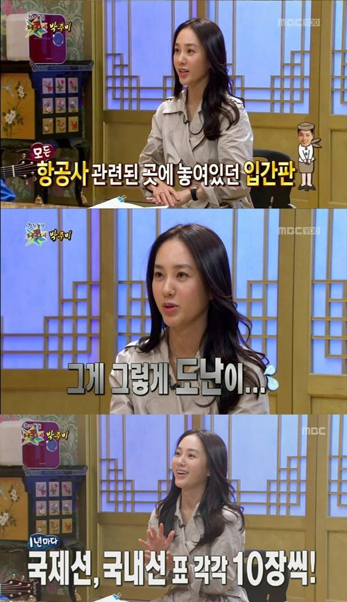 박주미는 지난 11일 방송된 MBC '황금어장-무릎팍도사'에서 "아시아나 항공사에서 8년간 모델로 활동을 했다"고 말문을 열었다.