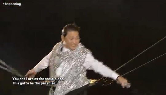 싸이는 "이어폰을 끼고 있지만 관객들의 함성이 너무나 선명하게 들린다"며 함께 노래를 불러준 것에 대한 감사의 말을 전했다.