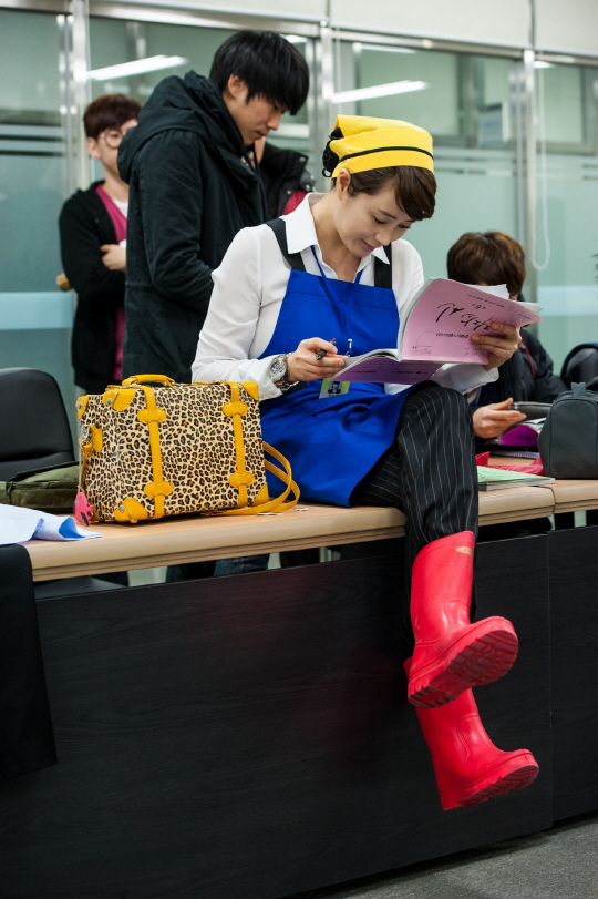 최근 공개된 사진에서 김혜수는 청소복 차림으로 테이블 위에 걸터앉아 대본을 암기 중이며, 오지호는 다리 한 쪽을 사무용품 정리대에 걸쳐 놓은 고난이도의 '쩍벌남' 자세로 대본을 외우고 있다. 대본을 외우는 모습에서도 드라마 속 캐릭터에 대한 열정이 느껴지는 두 배우의 모습.