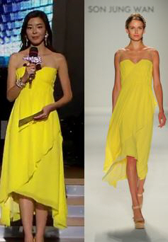 지난 12일 방송됐던 MBC '댄싱 위드 더 스타3'에서 MC를 맡고 있는 김규리는 비비드한 노란 드레스를 입고 봄의 여신의 자태를 뽐냈다. 하늘하늘 거리는 치마 끝자락이 여성미를 물씬 풍기는 듯한 이 드레스는 손정완 컬렉션으로 알려졌다. 특히 아찔한 튜브탑 드레스를 연상시키지만 실은 어깨부분을 시스루로 디자인하여 감각적인 디테일을 더해 착시효과를 전해주는 것이 특징이다.