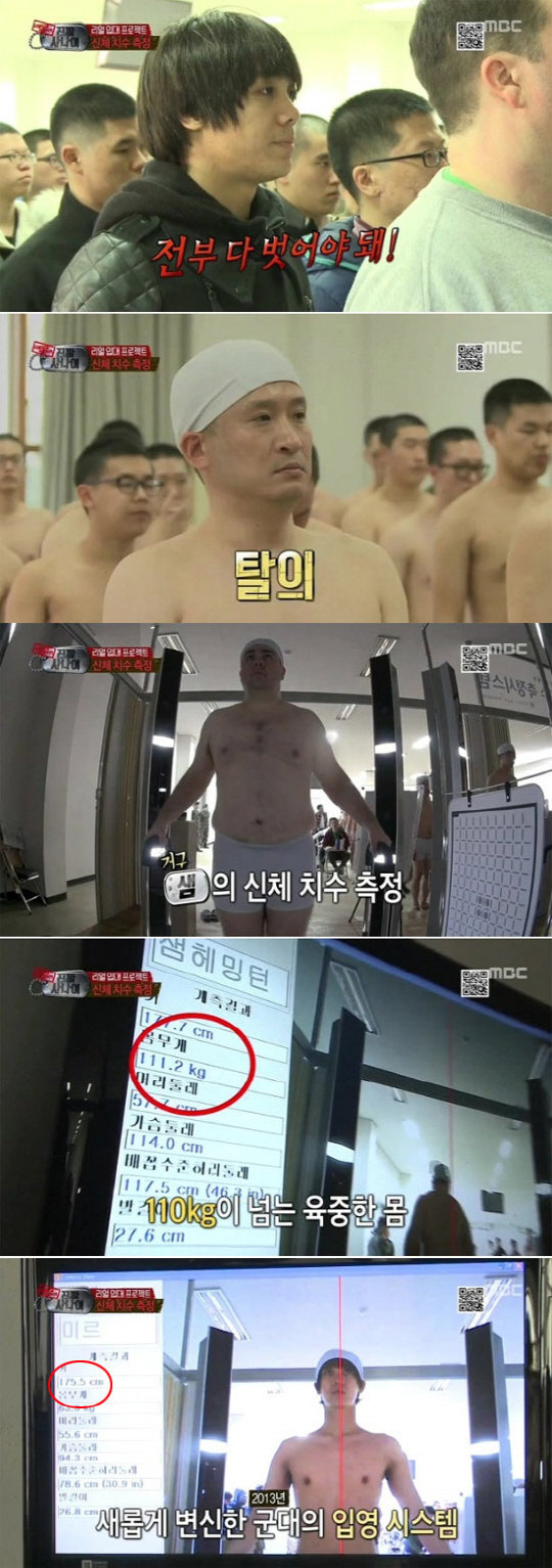 이날 방송에서 출연진들은 대한민국 육군본부의 협조를 받아 육군훈련소 입소부터 자대배치까지의 과정을 생생하고 리얼하게 보여줬다. 특히 전체 신체 치수 측정 및 전투복, 전투화 같은 보급품 확인 및 착용을 위해, 과감하게 속옷만 남긴 채 전부 탈의하고 측정기에 올라가는 모습이 눈길을 끌었다.