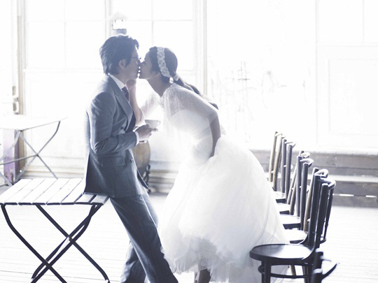 순백의 벨라인 웨딩드레스를 입은 박솔미는 따뜻한 햇살이 비치는 창가에서 한재석에게 설레임 가득한 입맞춤을 하고 있다. 커피잔을 든 한재석의 멋드러진 포즈와 나무 가구들이 클래식 영화의 한 장면 같은 느낌을 자아낸다.