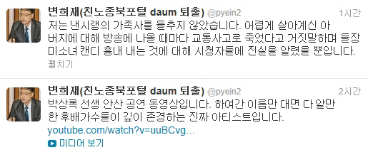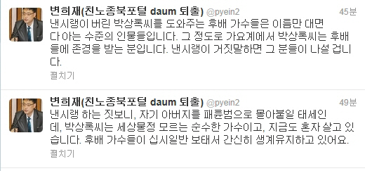 변희재 대표는 16일과 17일 자신의 트위터에 "낸시랭의 생부가 살아있다"는 내용의 글을 게재했다. 그는 "낸시랭은 대학원 졸업 후 아버지가 교통사고로 돌아가셨다고 주장한다. 그는 끝까지 (부친이) 죽었다 우기지만, 지금 아주 어렵게 살아계신다"며 "박상록 씨는 한국에 팝을 최초로 보급했으며 지금도 경기 인천 지역에서 팝송을 보급하고 있다. 세상물정 모르는 순수한 가수이고, 지금도 혼자 살고 있다. 후배 가수들이 십시일반 보태 간신히 생계유지 하고 있다. 인성이 좋아 후배 가수들 챙기는 걸로 유명한 분으로 딸이 잘 되기만을 바라고 있다. 낸시랭은 목에 칼이 들어와도 부친이 죽었다고 우길 것"이라고 주장했다. 이어 "나는 낸시랭의 가족사를 들추지 않았다. 어렵게 살아계신 아버지에 대해 방송에 나올 때마다 교통사고로 죽었다고 거짓말하며 들장미 소녀 캔디 흉내내는 것에 대해 시청자들에게 진실을 알렸을 뿐"이라고 덧붙였다. 또 박상록씨의 2011년 안산 공연와 2012년 종로 공연 동영상 링크를 첨부하기도 했다.