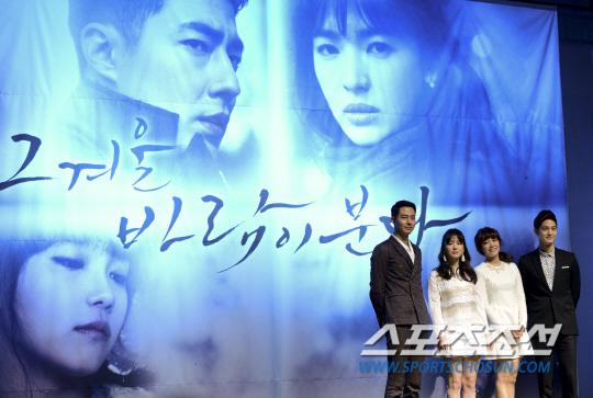 31일 서울 한남동 블루스퀘어에서 SBS 드라마 '그 겨울, 바람이 분다' 제작발표회가 열렸다. '그 겨울, 바람이 분다'는 유년시절 부모로부터 버려지고 첫사랑에 실패한 후 의미 없는 삶을 사는 오수(조인성)와 부모의 이혼과 오빠와의 결별, 갑자기 찾아온 시각 장애로 외롭고 고단한 삶을 사는 오영(송혜교)이 만나 차갑고 외로웠던 그들의 삶에서 희망과 진정한 사랑의 의미를 찾아가는 이야기로 2월 13일 첫 방송된다. 조인성(왼쪽부터), 송혜교, 정은지, 김범이 포토타임에서 포즈를 취하고 있다. 김보라 기자 boradori@sportschosun.com /2013.01.31/