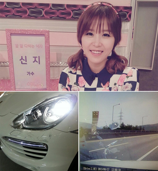 신지는 17일 자신의 트위터에 "인천 집에 기분 좋게 오는 길에 앞차에서 날아온 건지 도로에 떨어진 걸 앞차가 밟아서 튀어온 건지 쇳덩이로 차가 날아와서 내 애마가... 어떻게 보상받나요?"라는 글과 함께 사진을 게재했다.