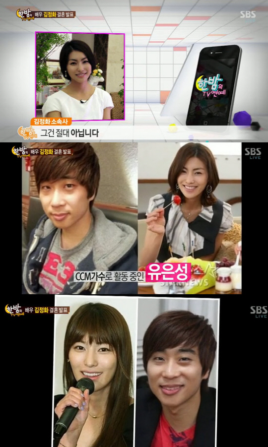 이에 김정화 소속사측과의 '한밤의 TV연예' 전화 인터뷰에서 "혹시 혼전임신은 아닌지?"라고 묻자 "그건 절대 아닙니다"라며 단호히 말했다. 또 "CCM쪽에 워낙 유명한 분이시고 유은성 전도사님도.."라며 "유은성 전도사님과 김정화씨는 기아대책 홍보대사에요. 좋은 일 하다가 만나신 거니까 그러다 이끌린 거겠죠"라고 말했다.