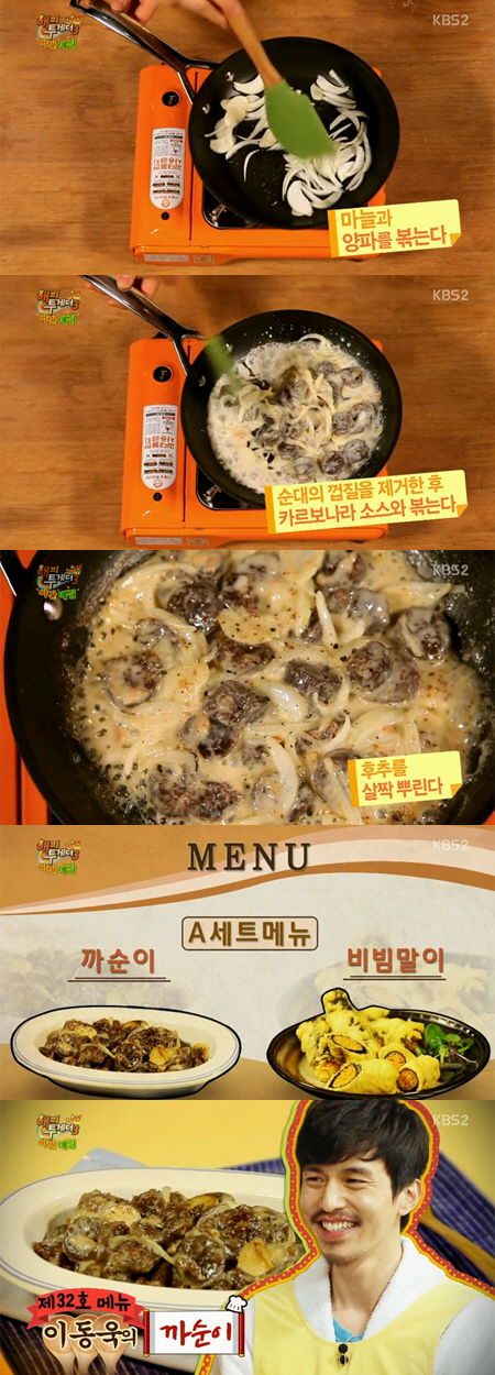 이동욱이 설명한 '까순이'의 레시피는 간단했다. 달군 프라이팬에 마늘과 양파를 볶은 후 껍질을 제거한 순대와 시중에 파는 카르보나라 소스를 넣고 볶은 다음 후추를 뿌리면 완성. 카르보나라 소스가 없을 때는 즉석 크림수프를 사용해도 되고, 짜거나 냄새를 없애려면 우유를 넣어도 된다.