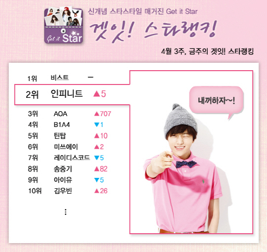 돌아온 겟잇스타랭킹! 겟잇스타랭킹 2013년 4월 3주차에선 인피니트를 주목해보세요. '남자가 사랑할 때'로 인기몰이 중인 인피니트가 꾸준히 순위를 올린 끝에 정상 등극을 눈앞에 두고 있습니다. 과연 4월 4주차에는 '부동의 TOP' 비스트를 끌어내리고 1위에 인피니트라는 네 글자를 새겨 넣을 수 있을까요?