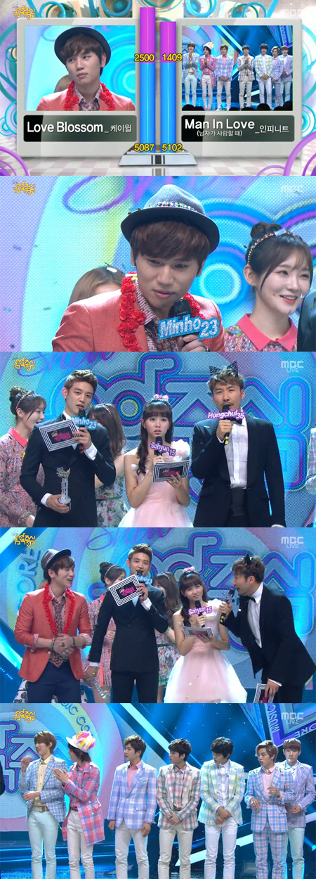 이에 MC 노홍철은 "오늘의 1위는 케이윌이다"라고 외쳤고, 이와 함께 무대에는 꽃가루가 터졌다. 이어 MC 민호는 "수상소감을 말해달라"며 마이크와 트로피를 건넸다.