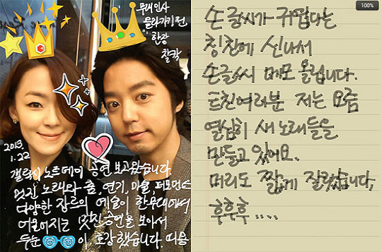 공개된 사진에서 김윤아는 '손글씨가 귀엽다는 칭찬에 신나서 손글씨 메모 올립니다. 트친여러분 저는 요즘 열심히 새 노래들을 만들고 있어요. 머리도 짧게 잘랐습니다. 후후후'라는 문장으로 자신의 요즘 생활과 달라진 헤어스타일을 전했다. 그녀의 외모만큼 정갈하고 예쁜 글씨체가 보는 이들의 시선을 사로잡는다. 또 같은 날 김윤아의 남편 김형규도 자신의 트위터 계정에 "어제 행사에서 공작부인과 찰칵"이라는 제목의 글과 함께 사진 한 장을 공개해 아내의 모습을 찍어 올렸다.