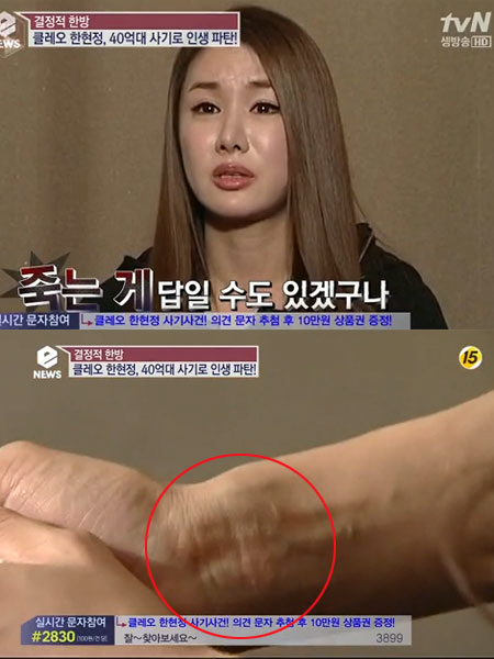이날 한현정은 인터뷰에서 "자고 싶어도 못자고, 살아보려고 노력해도 이 일(사기사건)이 날 억누르니까 죽는 게 답일 수 있겠다 생각했다"며 "약도 먹어보고 손목도 그어보았다"고 자살시도에 대해 고백했다.
