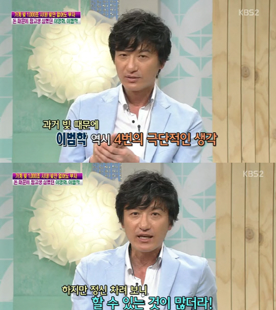 이범학은 24일 방송된 KBS 2TV '여유만만'에 출연해 빚 때문에 힘들었던 과거의 생활고와 현재 나아진 경제 생활 등을 솔직하게 털어놨다.