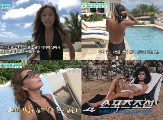 김진아는 80년대 섹시 아이콘이자 톱스타로 당시 이국적인 외모와 고혹적인 눈빛으로 남성팬들의 가슴을 뒤흔들었던 미녀배우. 30년전 20대 초반 영화 속에서 선보였던 한뼘 수영복 몸매와 비교해도 차이 나지 않는 늘씬하고 탄력있는 몸매가 시청자들의 눈길을 사로잡았다.