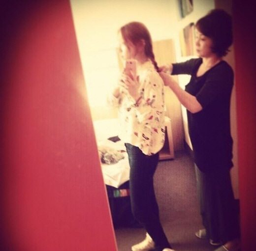 태연은 24일 자신의 인스타그램에 "아주 아주 오랜만에 엄마가 만져주는 머리"라며 사진 한 장을 게재했다. 공개된 사진에서 태연의 어머니는 거울 앞에서 딸의 머리를 땋아주는 모습이다. 특히 올블랙으로 의상을 통일한 패션 감각과 단아한 외모가 눈에 띈다.