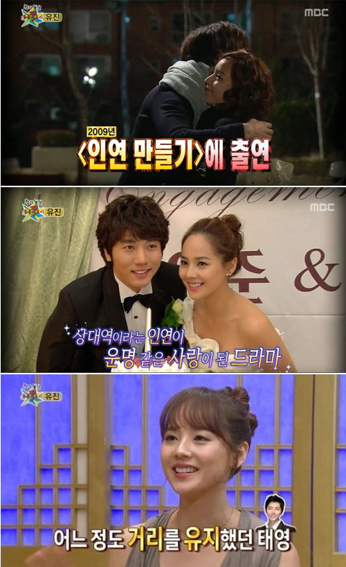 유진은 지난 25일 방송된 MBC '황금어장-무릎팍도사'에서 지난 2009년 MBC 드라마 '인연 만들기'에서 처음 만난 기태영과의 이야기를 전했다.