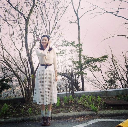 사진 속 장윤주는 베이지 컬러의 블라우스와 화이트 컬러의 롱 스커트를 매치해 여성스러운 매력을 뽐내고 있다. 한 쪽 머리를 넘기며 화사한 미소를 짓고 있는 그녀는 가죽 벨트와 민트 컬러의 양말을 함께 매치한 산뜻한 패션으로 봄날의 화사함을 한껏 발산하고 있다.