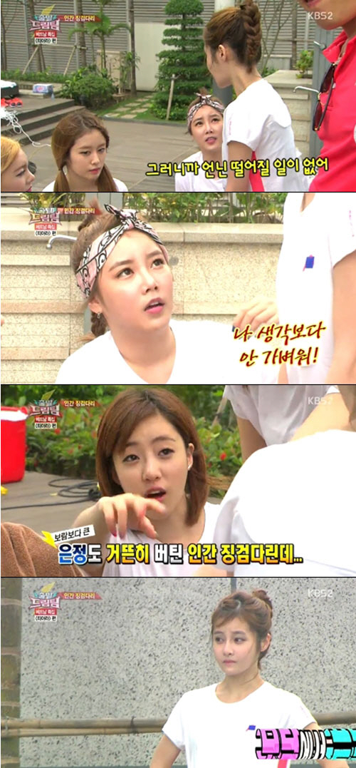 이날 티아라 멤버들은 남성들의 어깨를 밟고 앞으로 전진해야하는 '인간 징검다리' 게임에 도전했다.