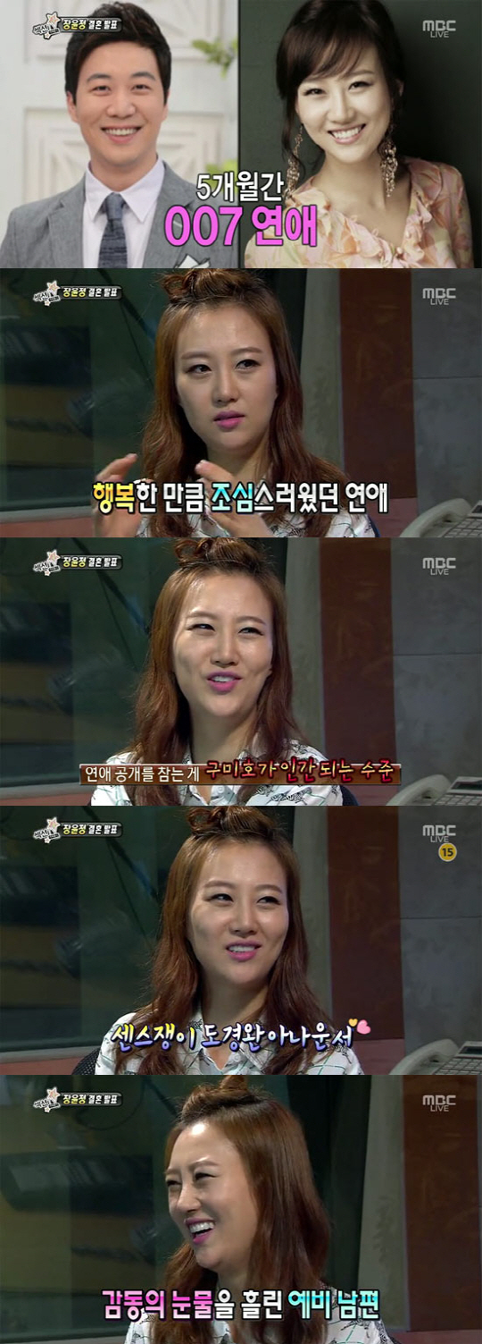 이어 비밀열애의 비화를 이야기 하던 중 "(도경완과) 술을 한잔 먹고 노래방으로 걸어 가는 사이 아주머니팬 분들이 나를 알아봤다"라며, "그 때 황급히 도경완의 등을 밀었고, 그 반동으로 도경완이 뒤도 안돌아 보고 노래방까지 가더라"며 도경완의 센스있는 대처를 자랑했다.